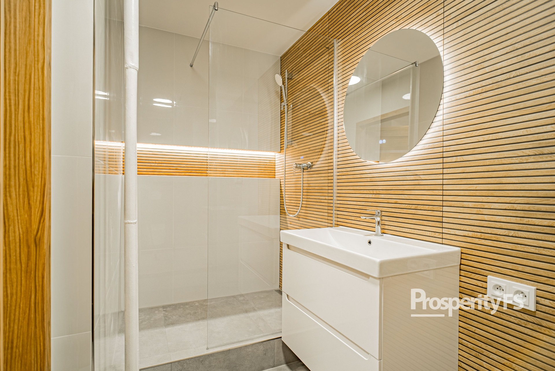 – Moderní koupelna se sprchovým koutem se žlábkem + místo pro pračku a sušičku