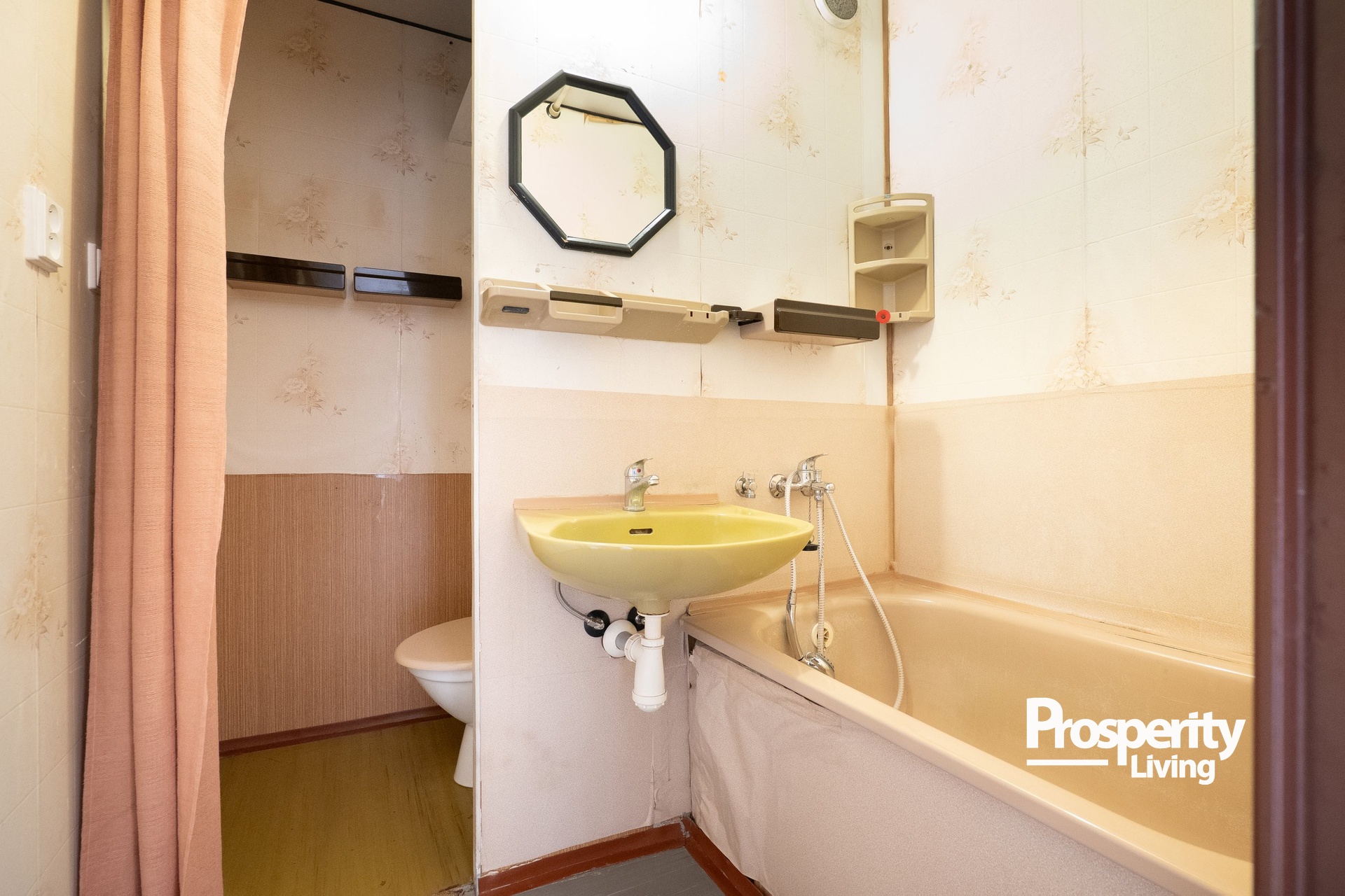 Dispozice bytu zahrnuje vstupní chodbu, prostorný obývací pokoj s kuchyňským koutem, samostatnou ložnici a koupelnu s toaletou. Jednotka je v původním stavu s umakartovým jádrem, plastovými okny se žaluziemi a podlahami pokrytými linoleem, což nabízí novému majiteli možnost úprav dle vlastních představ. K bytu náleží také sklepní kóje.