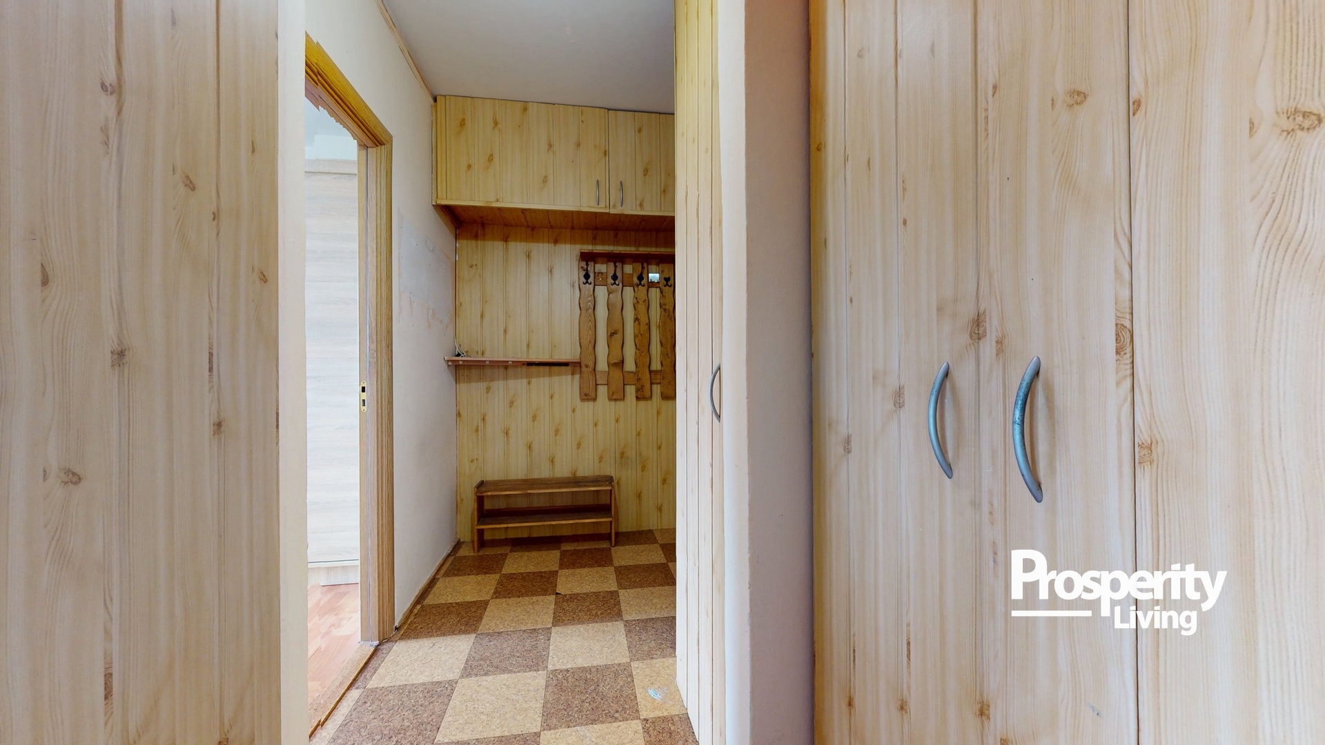 Dispoziční řešení bytu nabízí vstupní chodbu, prostorný obývací pokoj s kuchyňským koutem, ložnici a koupelnu s toaletou. Nabízený byt je v původním stavu, má umakartové bytové jádro, plastová okna se žaluziemi. Podlahovou krytinu tvoří plovoucí podlaha v kombinaci s keramickým obkladem. Velmi nízké měsíční náklady, lze získat na prohlídce. K bytu náleží sklepní kóje.