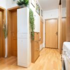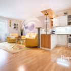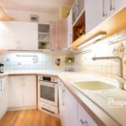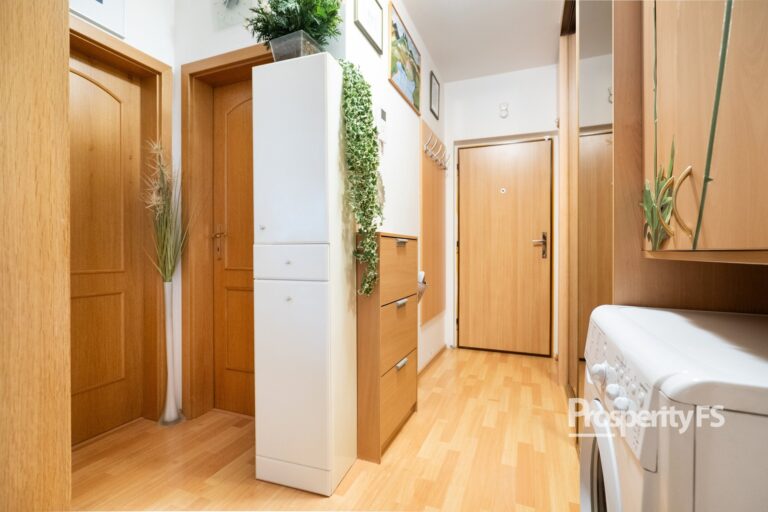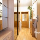 • Součástí bytu je zakázková kuchyňská linka s vestavěnými spotřebiči a dostatek úložného prostoru díky vestavěným skříním (dvě v ložnici a jedna v chodbě); další vybavení – pračka, skříňky, botník – je možné po domluvě ponechat