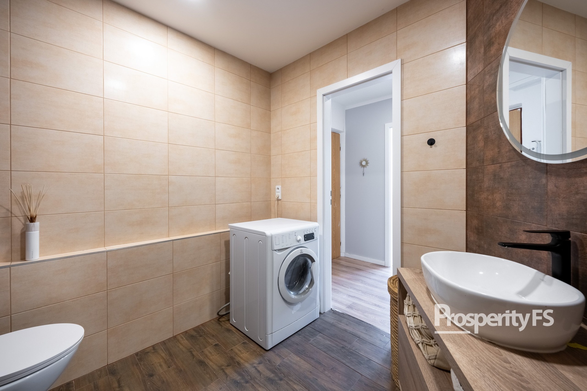 Ložnice i dětský pokoj nabízí dostatek prostoru a soukromí. Koupelna je vybavena vanou i místem na pračku – vše navržené prakticky pro rodinný život.
