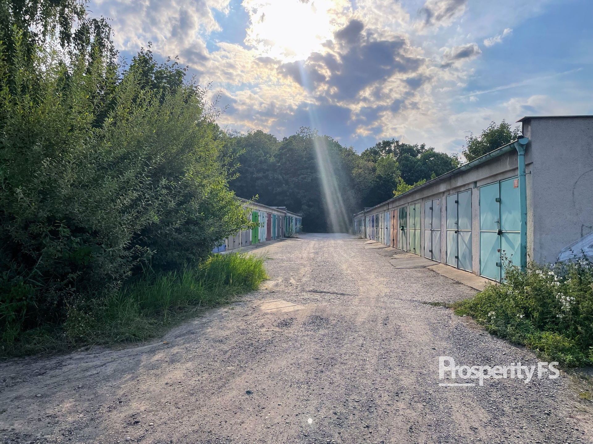 Příjezd ke garáži je částečně po asfaltové cestě a částečně po zpevněné (obecní cesta).