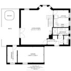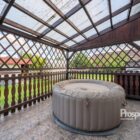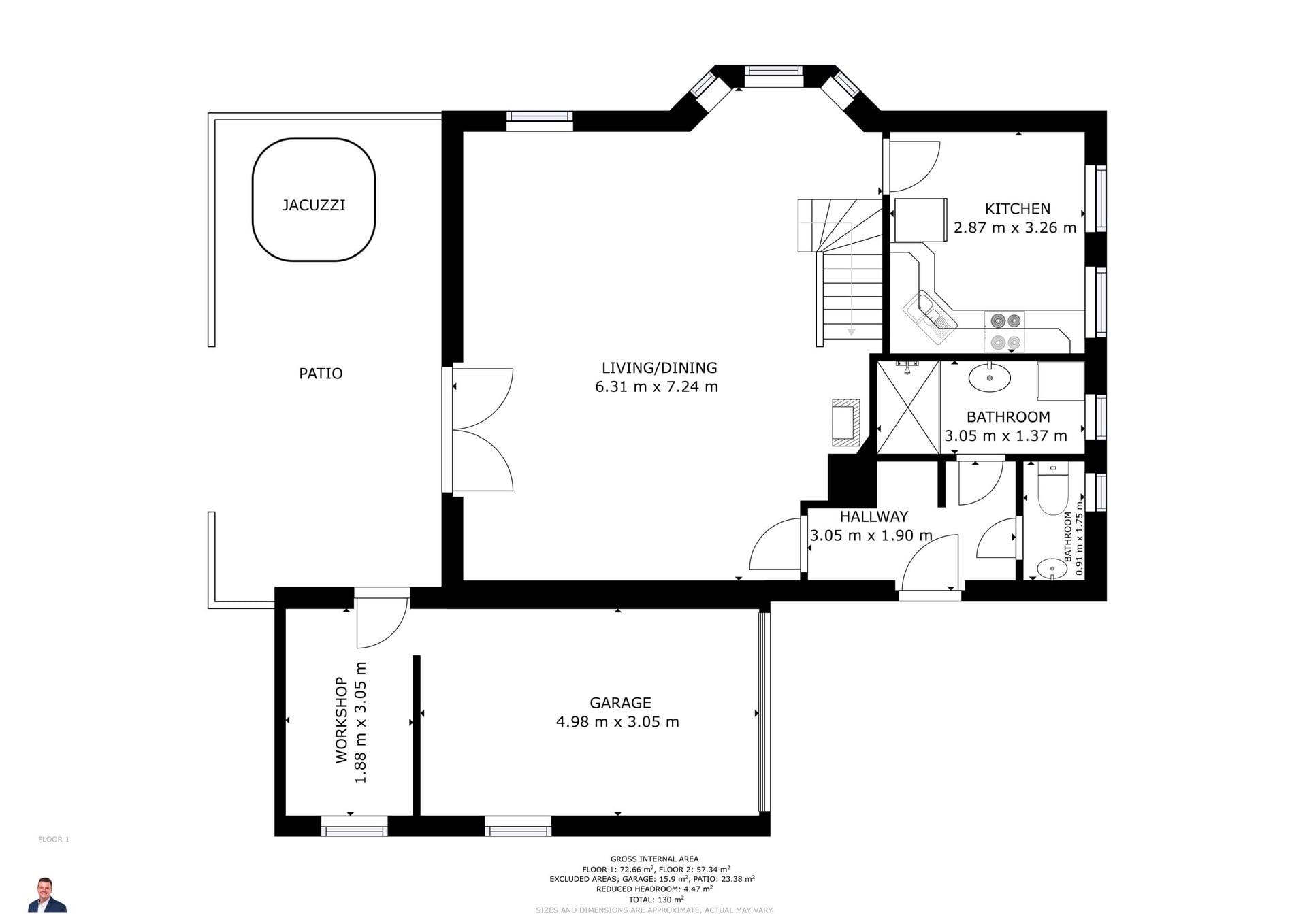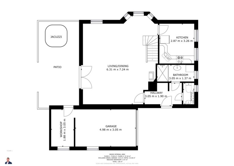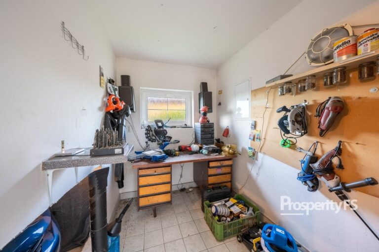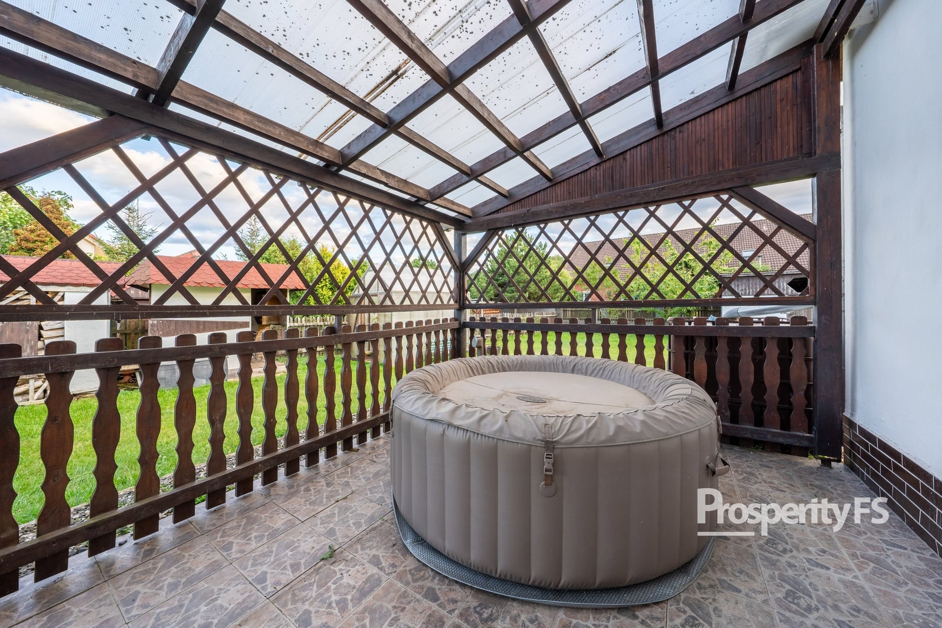 V přízemí vás přivítá prostorný obývací pokoj s krbem, který navazuje na krytou terasu s vířivkou – ideální pro celoroční relax. Kuchyně je samostatná a prakticky řešená. Dále zde najdete koupelnu se sprchovým koutem a vstup do garáže s dílnou.