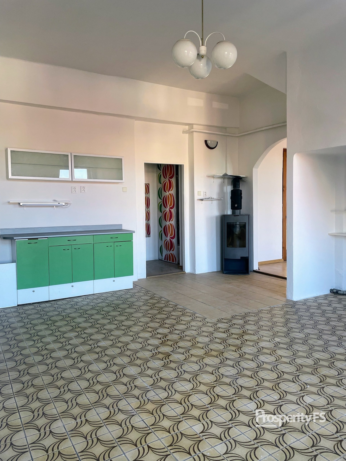 V bytě zůstává částečné vybavení (židle, stoly, skříňky, poličky).